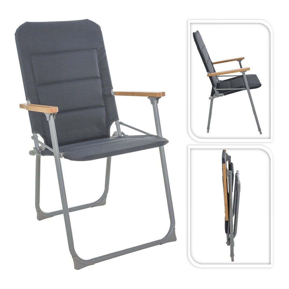 Silla De Camping Plegable, Tejido De Poliéster Espumado Color Gris, Estructura De Metal Con Recubrimiento De Polvo Gris Claro Con Tubos De Ø22/19 Mm, Reposabrazos De Bambú Y Con Refuerzo En Las Patas De Pp, Dimensiones 52 X 55 X 92 Cm