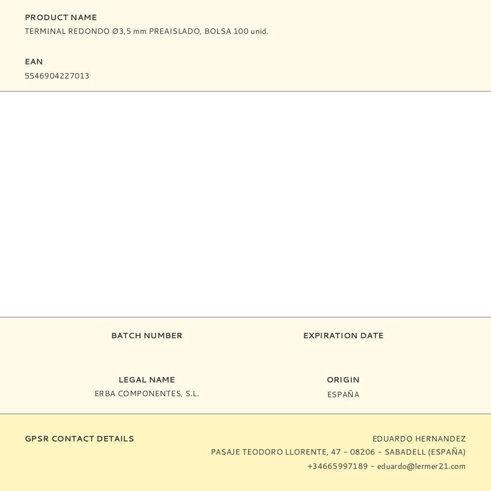 Terminal Redondo Ø3,5 Mm, Ø8,5 Mm Externo Preaislado, Bolsa 100 Uds