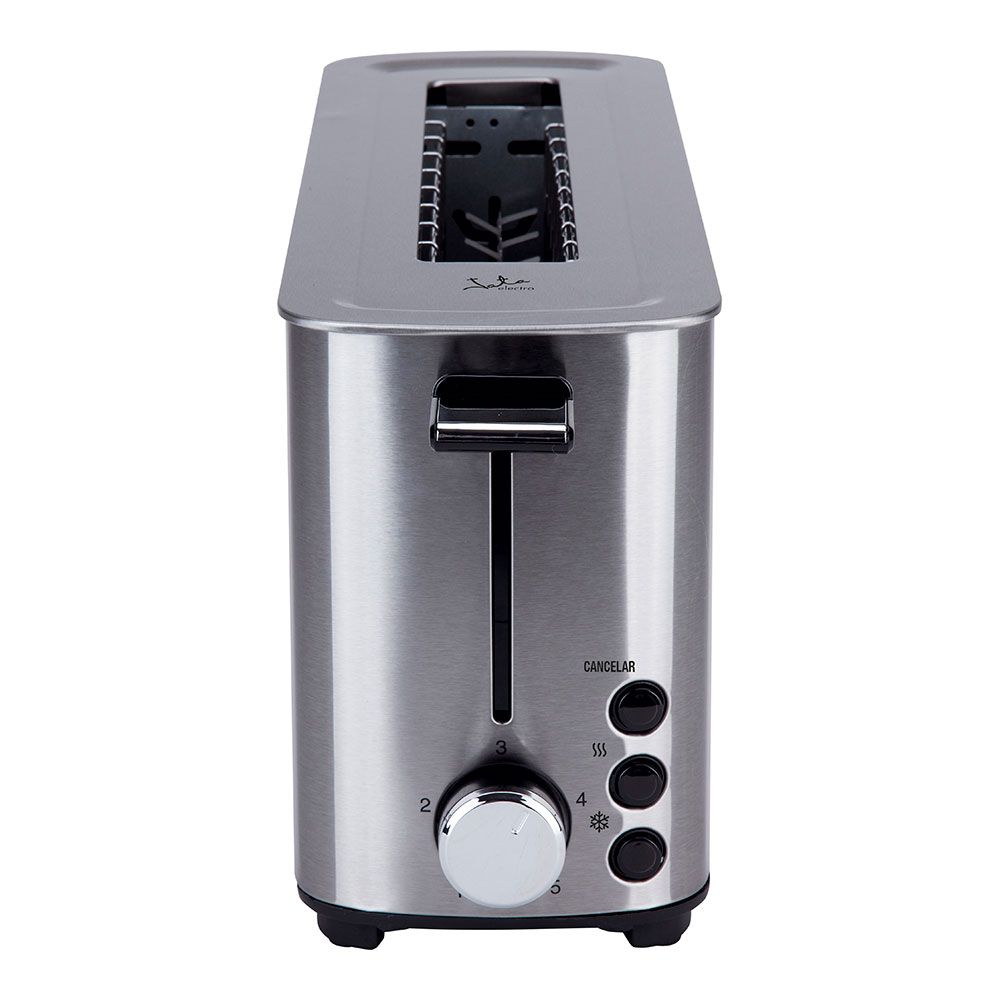 Tostador Con Cuerpo En Acero Inoxidable. Ranura Ancha De 40 Mm Para Todo Tipo De Pan, Centrado Automático Del Pan. Selector Electrónico De Tostado. 5 Posiciones. 2 Funciones: Descongelación Y Mantenimiento De Calor. Pulsador De Parada Voluntaria. Bandeja Recogemigas. Indicadores Luminosos Y Recogecable. Voltaje 230 V. Potencia Máx. 1.000 W