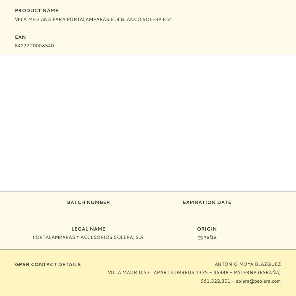 Vela Mediana Para Portalamparas E14 Blanco Solera 854