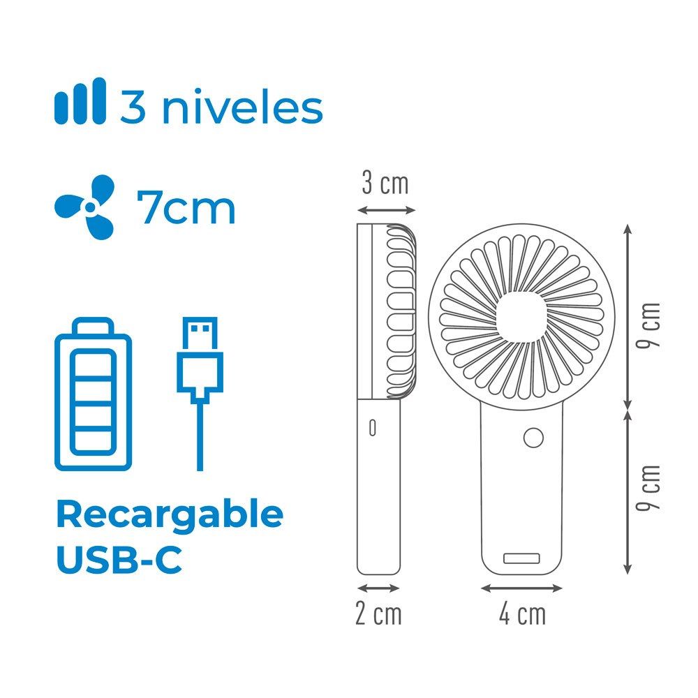 Ventilador De Mano Que Incorpora Una Base Extraíble Que, Al Estar Acoplada Al Ventilador, Funciona También Como Soporte Para Smartphone. 3 Niveles De Potencia, Recargable Por Puerto Usb-C De 20 Cm (Incluido), Batería 400 Mah, Rejilla De Seguridad, Tiempo De Carga 40 Min, Hasta 1 H De Autonomía. Dimensiones Aspas De Ø7 Cm, Dimensiones Ventilador 9 X 3 X 18 Cm, Presentado En Expositor De 25 Uds