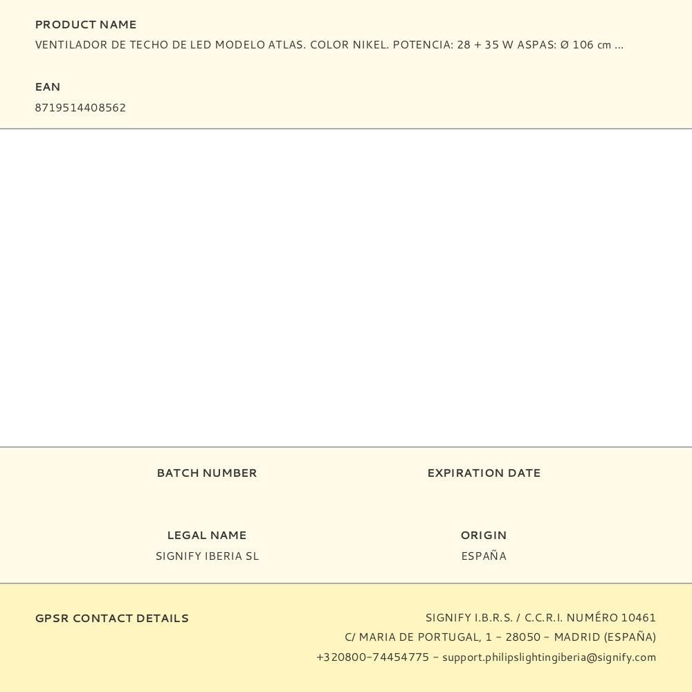 Ventilador De Techo De Led Modelo Atlas. Color Nikel Potencia: 28+35W Luz Led Con Posibilidad De Cambiar La Tonalidad De Luz 2700K-4000K-5500K Aspas Abatibles. Mando A Distancia. Ø106Cm 42,5Db 230Rpm Philips